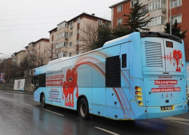 Kalp sağlığına dikkat çekmek için özel olarak tasarlanan İETT otobüsü 58A Poligon Mahallesi – Kabataş hattında hizmet vermeye başladı.